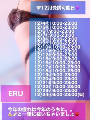 12/24を最終日と思ってましたが 生理が早まる可能性もあるので 12/24は当日になってから受講(予約)可能かどうかお知らせします♡