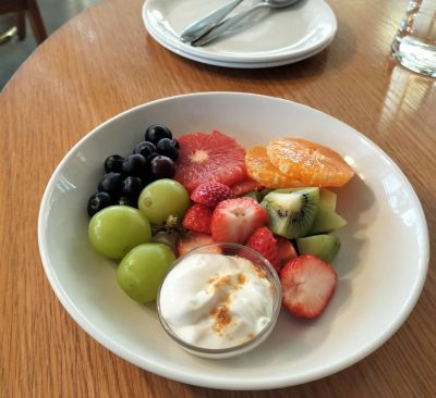 リコッタチーズのパンケーキとフルーツボール(グリークヨーグルト)を🍓