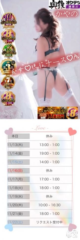 ♡かやの♡🎀スケジュール🎀なども完成版日記に書いてありますので、シティヘブンに登録してできればお店のオフィシャルサイトにも登録されてくださいね♪シティーヘブンに登録した際には、マイガールに登録するときにトークと言うメッセージ機能が使えますが、文字制限いっぱいに書かれてくださいね。もしご予約をお店やシティーヘブンの方からされる場合には、備考欄の隙間のところに置きにトークのニックネームを記載されてくださいませ。市内や町田近辺は車で運転して伺いますが、都内は電車で伺いますので、湘南新宿LINE横須賀LINEだったと思うのですが、横浜で乗り換えるので乗り換えが少ない都内でしたらとても助かります。普段はアスリートなどで運動靴しか履いていないので、できれば駅から5分以内のところにエロエロなホテルがあると、もっとエロくなれる🌹かやの🌹。