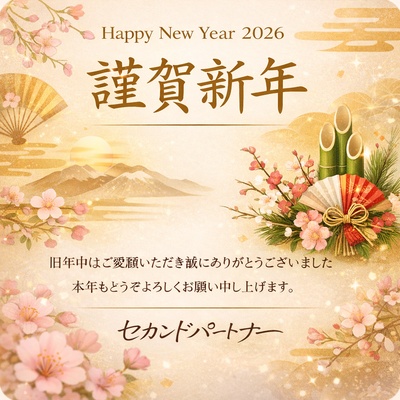新年あけましておめでとうございます。 昨年は「セカンドパートナー」をご利用いただき、誠にありがとうございました。 本年も、心が安らぐひとときをお届けできるよう努めてまいります。 2026年も、どうぞよろしくお願いいたします。 <セカンドパートナー>