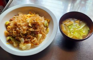 でランチに素麺チャンプル&春キャベツ味噌汁