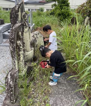 じょうろ で水撒き 塚の周りの お掃除
